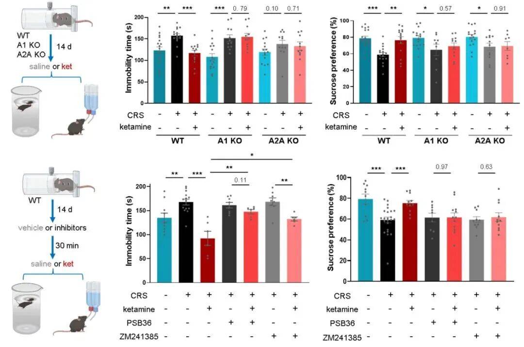图 2. 遗传学与药理学手段证明腺苷信号介导了氯胺酮的快速抗抑郁表型