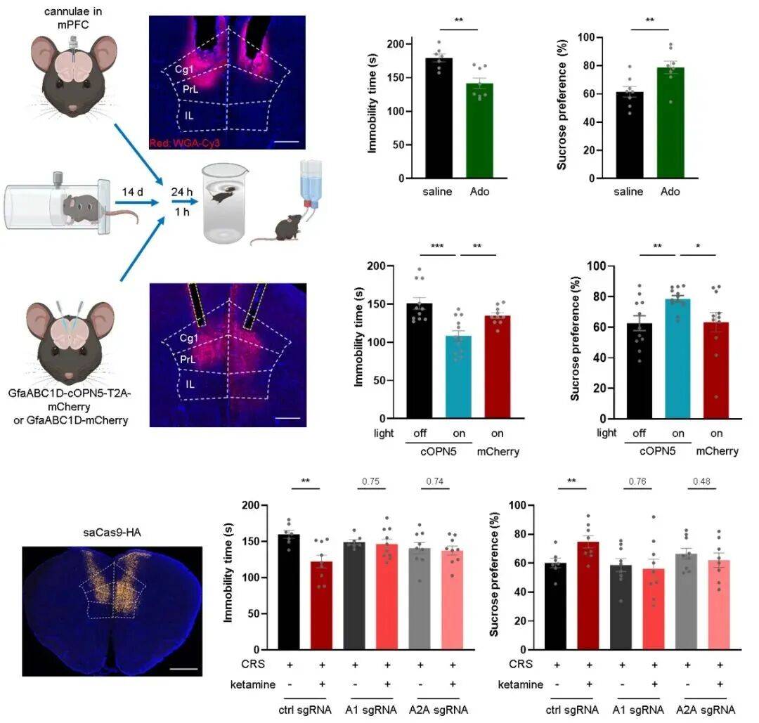 图 3. 内侧前额叶皮层腺苷信号与抗抑郁表型之间的充分必要性