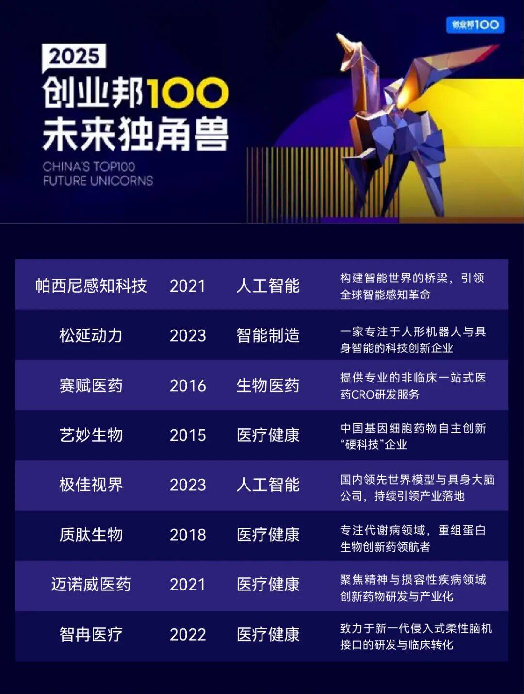 近日,由创业邦发起的2025年“未来独角兽”榜单评选结果最终揭晓,共有帕西尼感知科技、松延动力、赛赋医药、艺妙生物、极佳视界、质肽生物、迈诺威医药、智冉医疗八家昌发展生态投资企业入围榜单。
