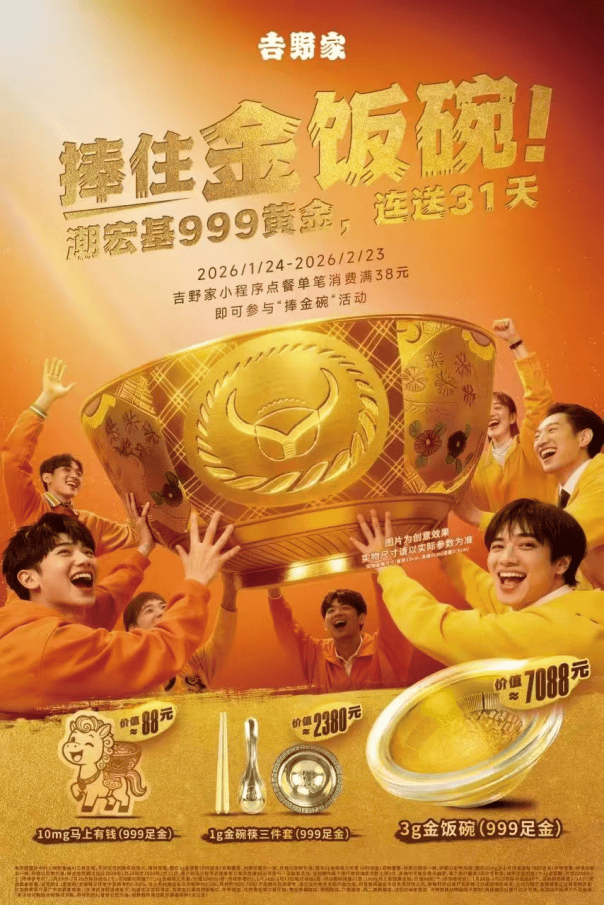 2026年1月24日-2月23日,在吉野家小程序点餐单笔消费满38元,即可参与「捧金饭碗」活动,有机会赢取黄金好礼,999足金诚意满满,新年讨个好彩头!