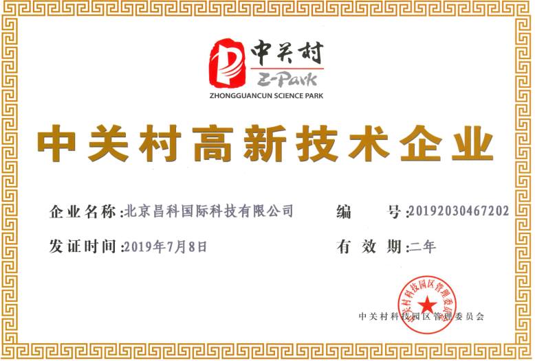 北京昌科国际科技有限公司(简称昌科国际) 荣获中关村高新技术企业称号,