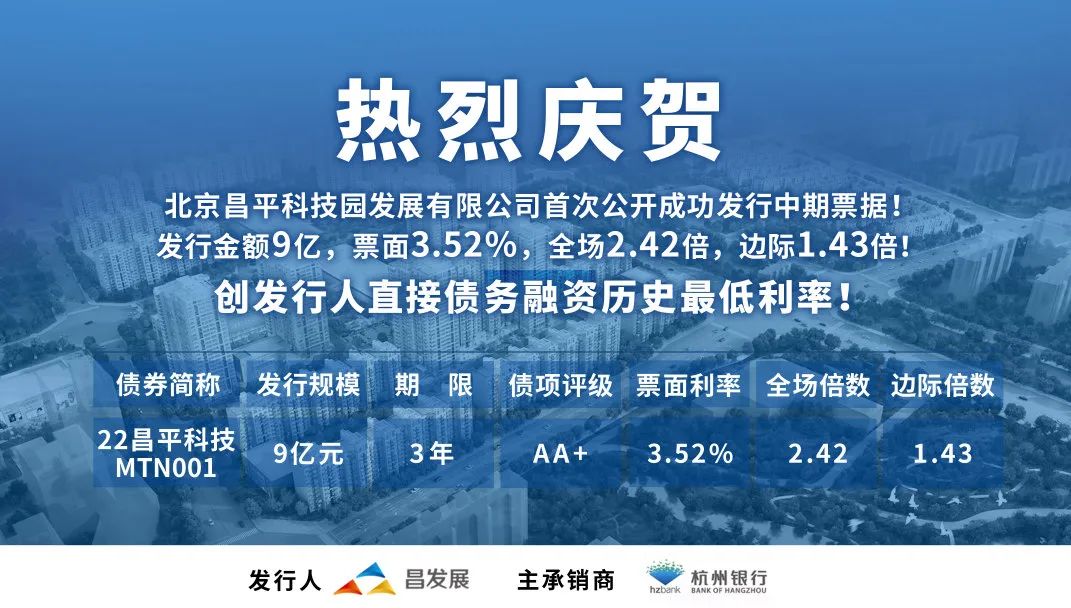 昌发展首次公开成功发行中期票据。发行金额9亿,票面3.52%,全场2.42倍,边际1.43倍,创昌发展直接债务融资历史最低利率。