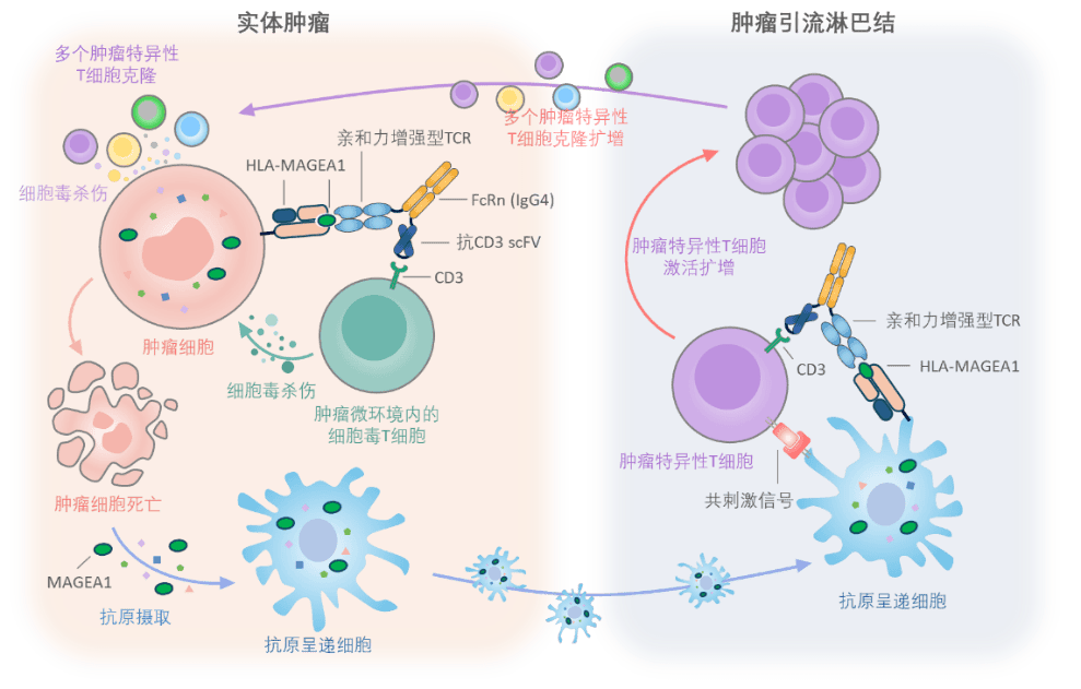当肿瘤细胞被杀伤后,释放出的多种肿瘤相关抗原被树突状细胞等抗原呈递细胞摄取、加工并迁移至肿瘤引流淋巴结这个“第二战场”。在这里,CRPA1A2桥接抗原呈递细胞和T细胞:TCR结构域识别呈递MAGE-A1肽段的抗原呈递细胞(如DC),抗CD3结构域为T细胞提供激活与共刺激信号,促使多克隆肿瘤特异性T细胞被DC更高效地激活并大规模扩增。这些经“二次放大”的多克隆T细胞再度回流肿瘤病灶及潜在转移灶,形成持续而广谱的免疫压力,既有望实现更持久的抗肿瘤效果,也能有效应对肿瘤异质性和抗原逃逸难题。