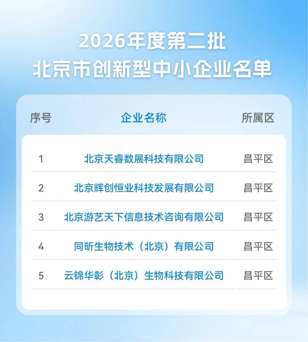 昌发展5家生态企业入选2026年度第二批北京市创新型中小企业名单
